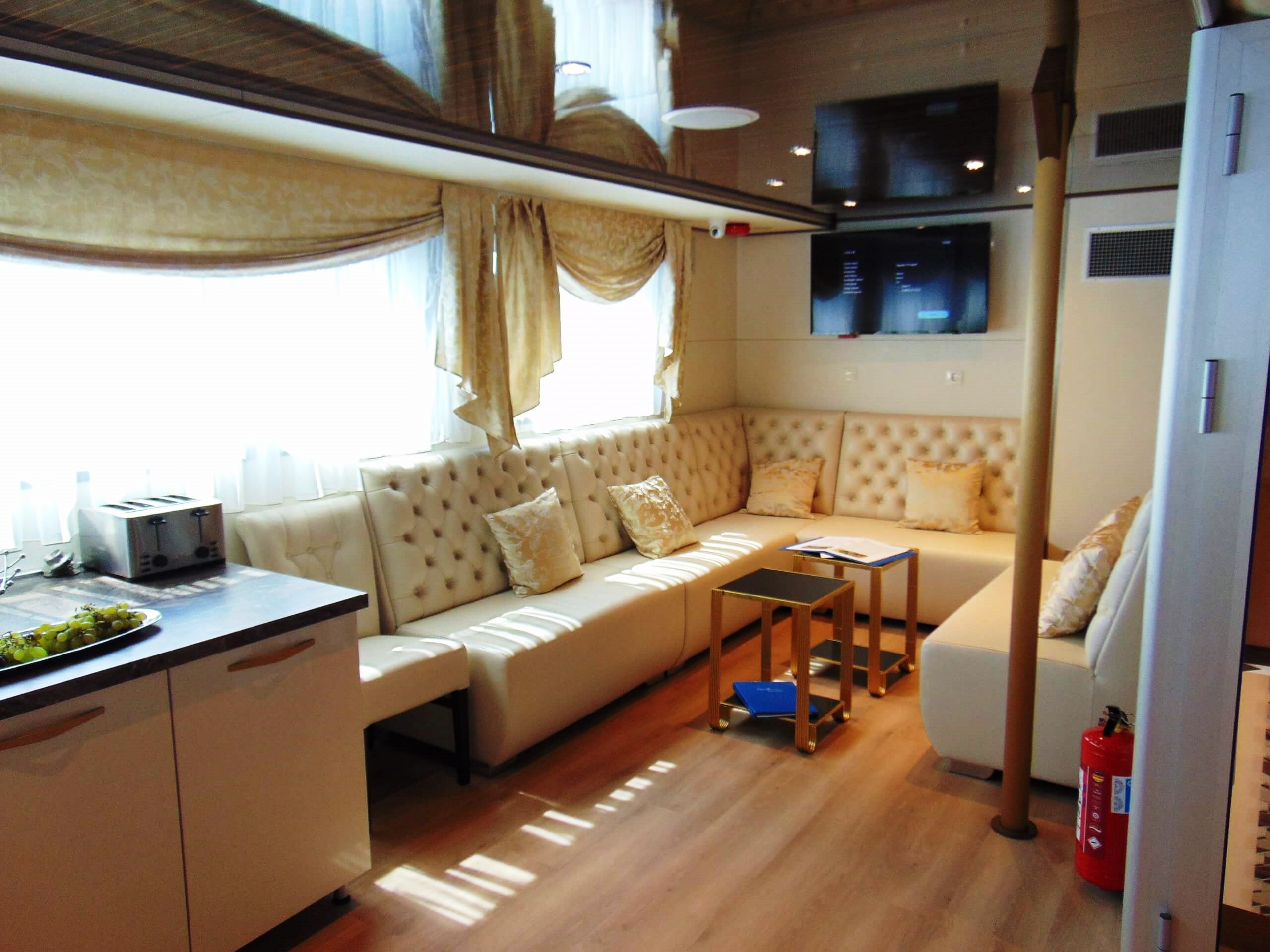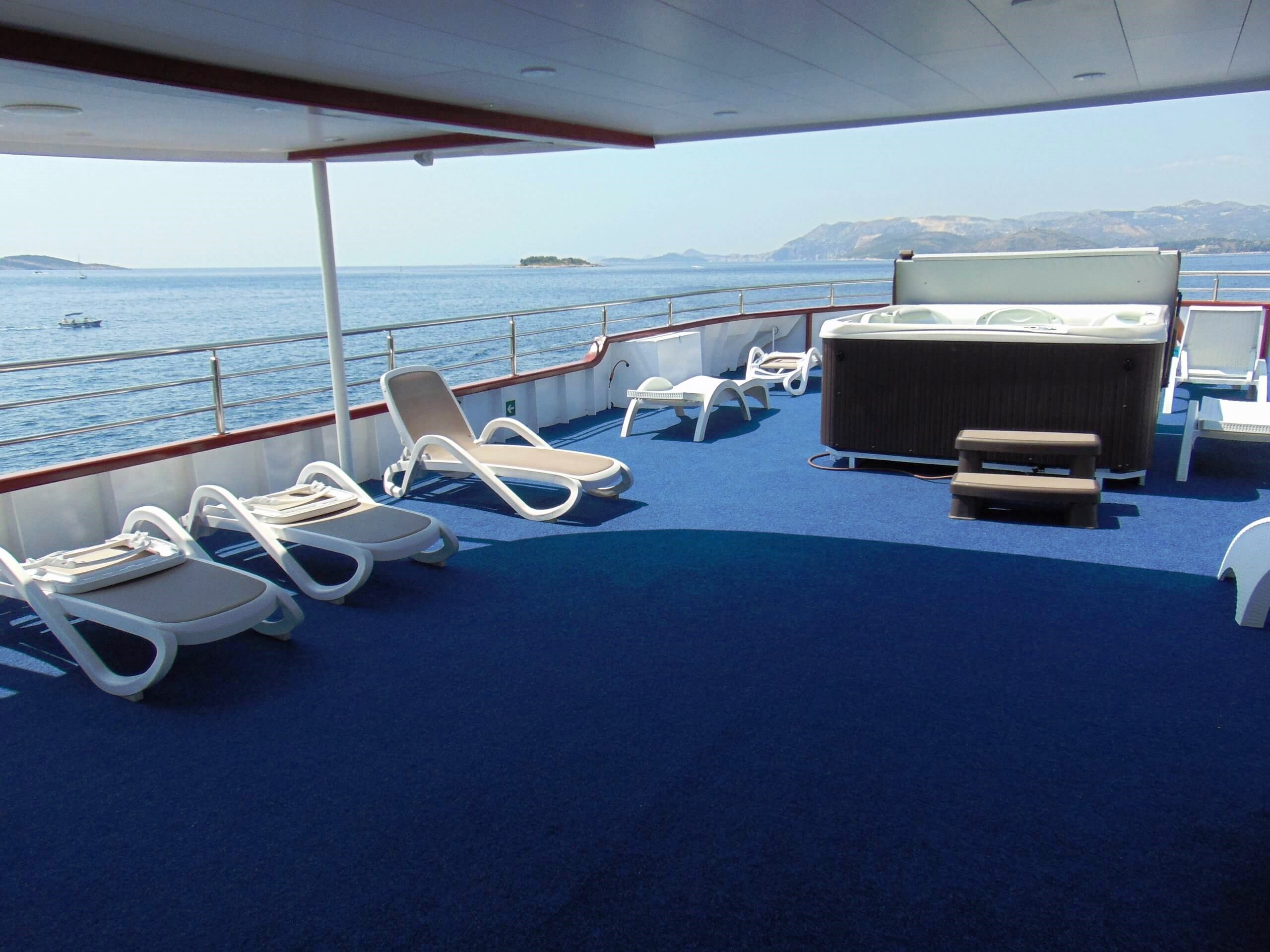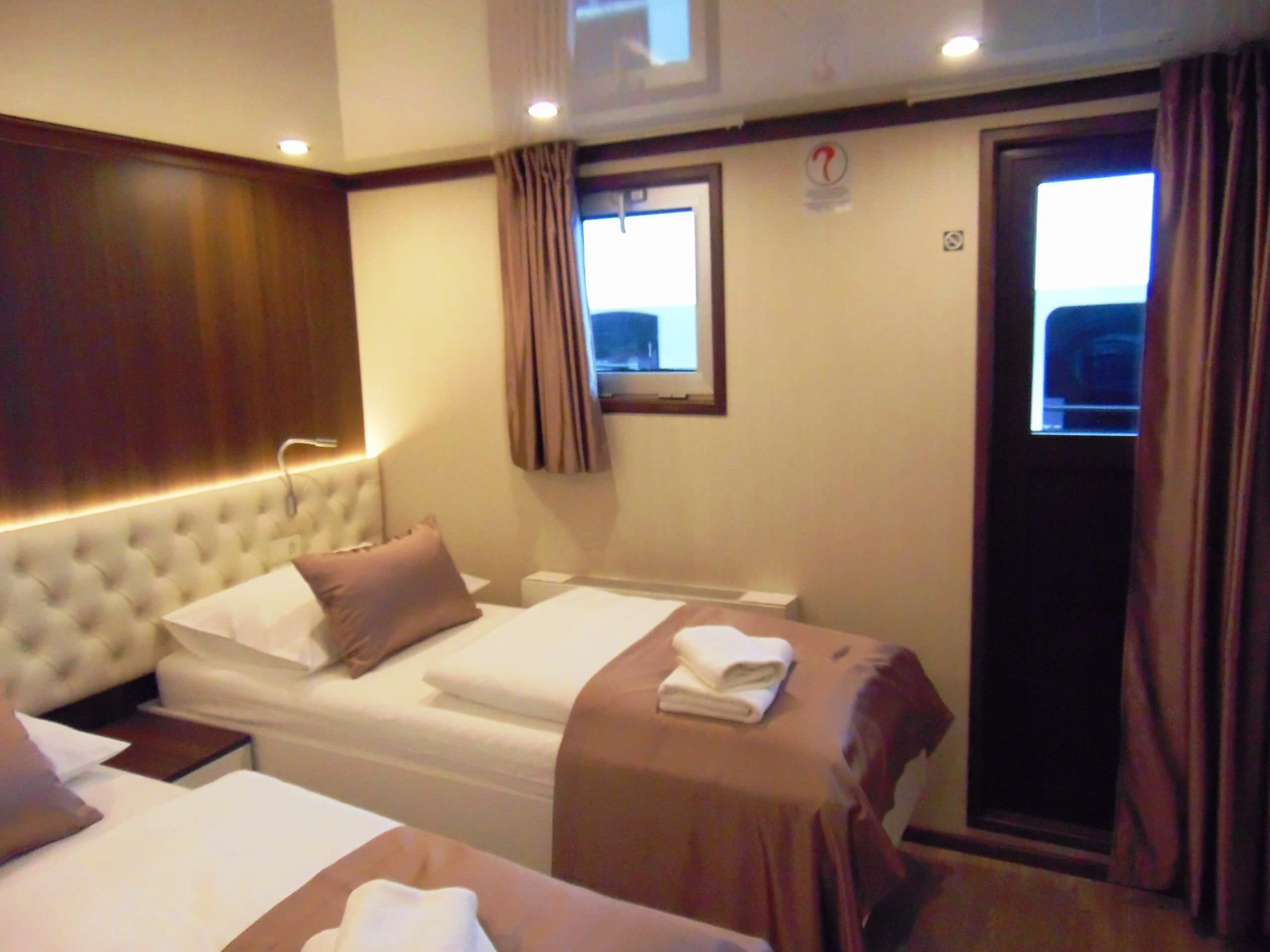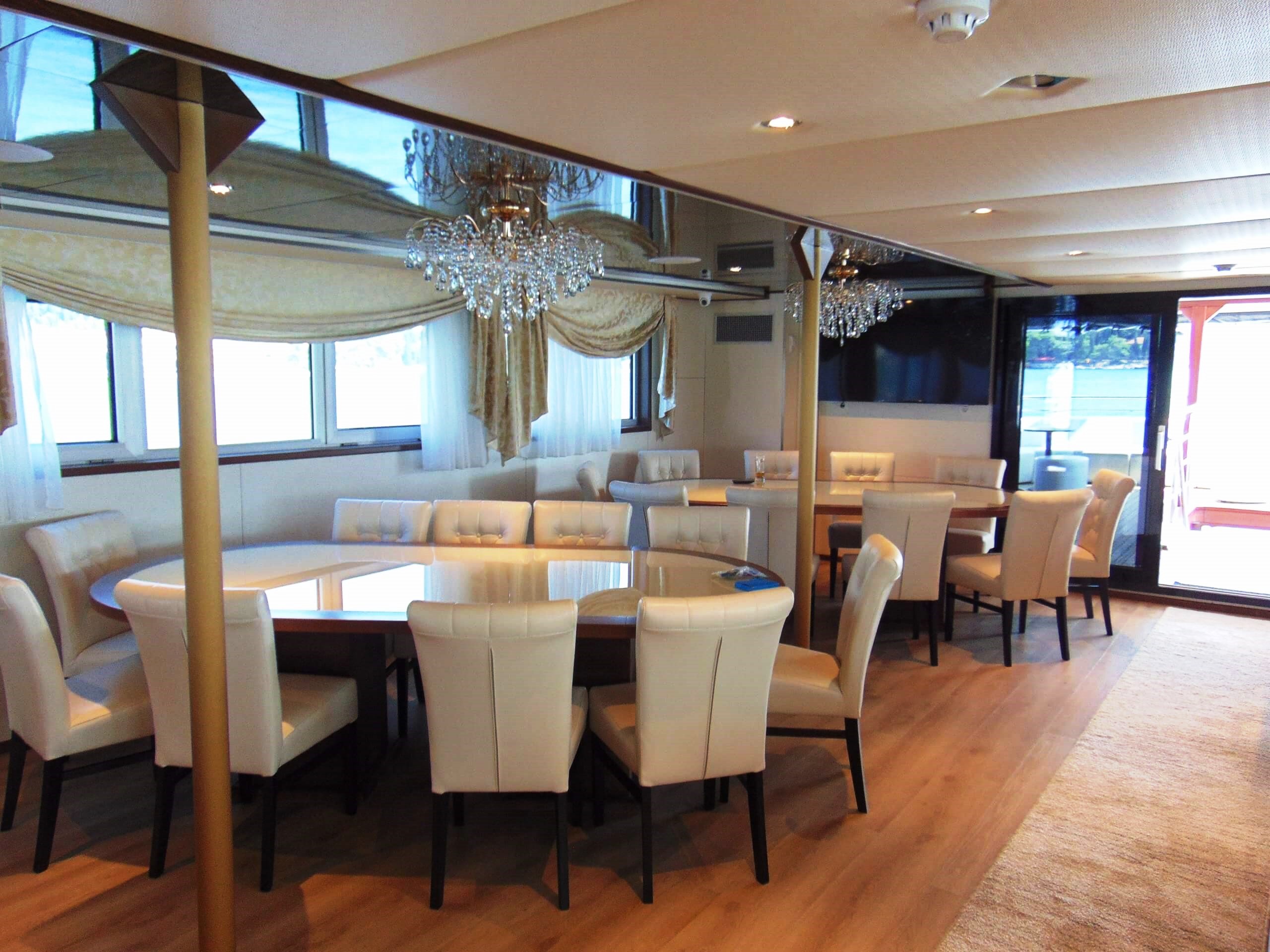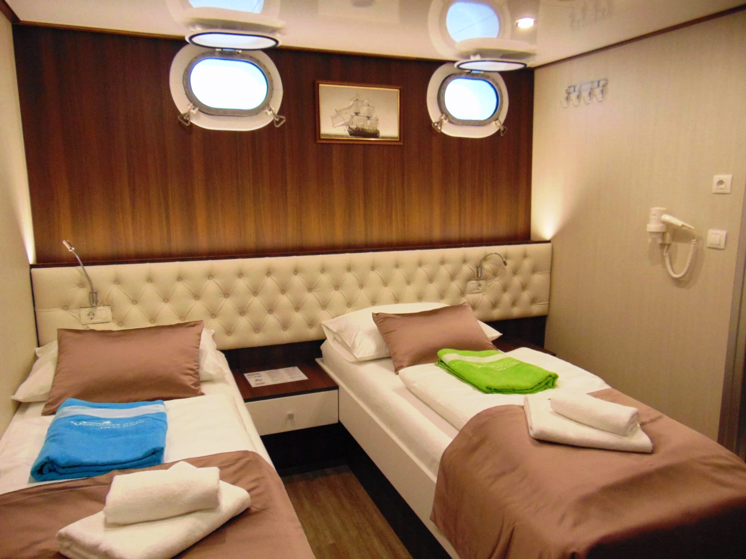 POPIS JACHTY: Na hornej palube jachty sa nachádza plne klimatizovaná jedáleň s veľkými oknami, samostatným barom a salónikom, LCD TV s veľkou obrazovkou, rohový stôl na raňajky formou bufetu, bezdrôtový internet, reproduktory a audio systém. Pred jedálňou sa nachádza terasa s posedením, stolmi a stoličkami. K dispozícií je motorový čln, paddleboardy, nafukovačky a kolesá do vody. V prípade šnorchľovania alebo potápania je potrebné doniesť si vlastné okuliare aj náhubok do vody. Jachta má plošinu na plávanie a 2 rebríky s držadlami, ktoré umožňujú ľahký prístup do vody. Loď má tiež dve vonkajšie sprchy so sladkou vodou a verejné toalety. Na hornej palube môžu všetci pasažieri relaxovať na slnečnej terase s rozlohou 390 m2 s ležadlami. Terasa na opaľovanie je čiastočne zatienená pre pohodlie klientov, tu budú prebiehať aj naše cvičenia. Môžeme si tu tiež vychutnať elegantnú strešnú vírivku. Dvojlôžkové kajuty sú umiestnené na dvoch palubách – hlavnej a dolnej /dolná paluba je super pre tých klienktov, ktorí majú radi tichšie prostredie/. Všetky kajuty pre hostí sú veľmi pohodlné a plne klimatizované, s ventilačným systémom umožňujúcim neustále prúdenie čerstvého vzduchu. Každá kajuta má modernú súkromnú kúpeľňu s toaletou a sprchou, v kajute sú uteráky a osušky. Kajuty sú vybavené nezávislým ovládacím panelom klimatizácie, satelitnou LCD TV, dizajnovými nástennými doskami, pracovným stolom a stoličkou, zrkadlom, nočnými lampami, trezorom, rádiom, fénom, elektrickým prívodom 220V, záchrannou vestou, šatníkovou skriňou, batožinovým priestorom pod posteľou, ako aj s najnovšími bezpečnostnými a protipožiarnymi systémami spolu so zvukovým systémom pre upozornenia posádky jachty. Všetky kajuty sú zvukotesné a majú protipožiarne dvere. Kajuty na hlavnej palube majú dvere na palubu, otváracie okno, okienko v kúpeľni. Kajuty na dolnej palube majú dve okienka a dvojitý ventilačný systém